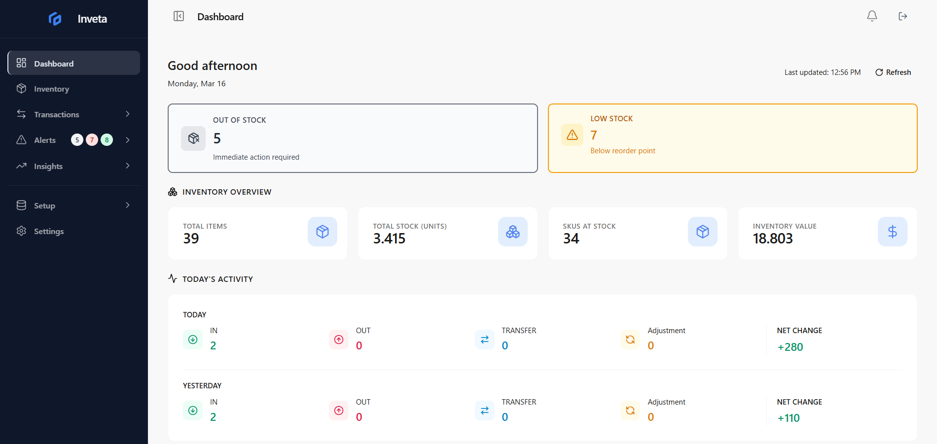 Inveta helps small teams track inventory, manage stock, and stay in control of their products.